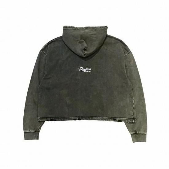 フロントはCHILLINのアーチロゴのプリント、クロップされた折り返しの縫い代にはダメージ加工が施されるなど、一般的なフーディーと一線を画したギミック。