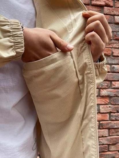 多少の雨を弾く撥水ナイロン生地を採用し、裏地はメッシュ仕様なので、パーカーとのレイヤーや、カットソーの上に織れる全天候万能なアイテム。